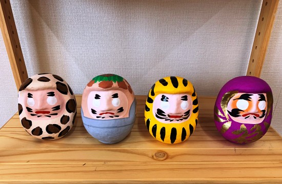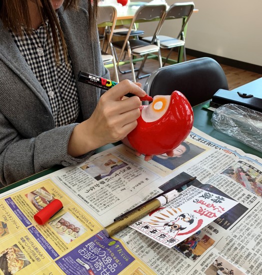 まずは、中々お目にかかれないお姿のだるまを一人一個。何かを真似て描くもよし、全く違うデザインでもよし。願いを込めながら筆を入れていきました。「うわ~手が震える~」思った以上に難しく、仲間とのおしゃべりもなくなる位、真剣に描きました。絵付けを始めて約1時間。ジャーン!どうでしょう?個性が出ているだるまたちが出来上がりました。どこか本人に似ていたり、一段と愛着が湧いてきました。可愛い♡だるまさんの赤い色は、魔除けの力を持つという考えから用いられてきました。だるまの目の入れ方は願をかける時は向かって右側の目、願いが叶ったら向かって左側の目とするのだそうです。