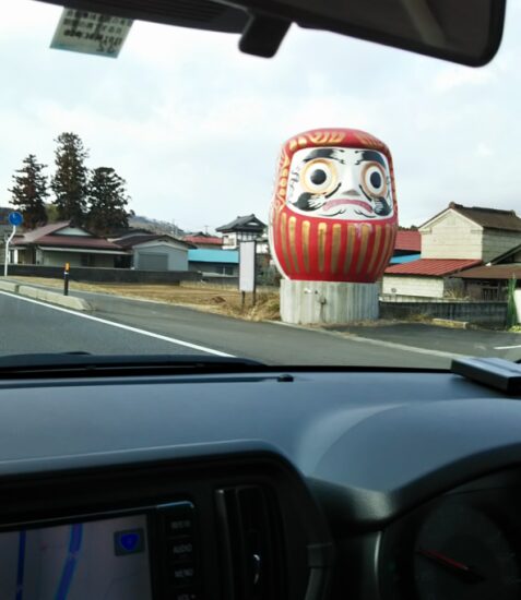 ドライブ旅もまだ前半ですが、この町を訪れると不思議とhappyな気持ちになってきました。それはご紹介する「白河だるま」を至る所で目にするからなんです!国道を走っていると、巨大だるま発見!さすがだるまの町!私達もさっそく工房を訪れることにしました。場所は東北自動車道白河ICを降りて、奥州街道を車で15分のところにあります。レンタカーならナビも付いているので目的地まで安心です。
