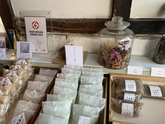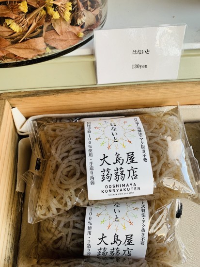 最後に訪れたのは江戸時代創業200年。参勤交代時代に夏は花火、冬には蒟蒻製造を生業に大名より「大島屋」の屋号を持つ老舗の「大島屋蒟蒻店」さんへ。東京で舞台俳優をしていた店主のセンスが光る素敵な内装。店頭や食卓ではあまり主役になることのない蒟蒻を「おいしくて、おもしろくて、かっこいい」そんな風にひとりでも多くの人に楽しんで貰えるようにと、数年前に母屋の土間を改装してショップをオープンしたそうです。