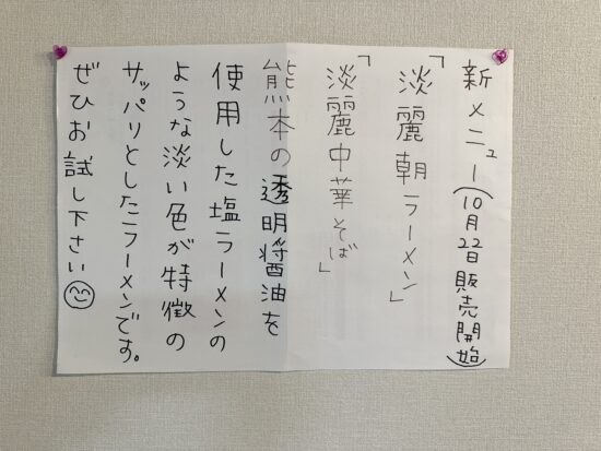 以前は美容師さんだったという店主。オープンのきっかけは、ラーメンが大好きで、10年ほど前からキャンプの締めでラーメンを食べるためにスープを自作するほどに。修行なし、全て独学でラーメンの味作りから始めたそうです。「オープンから半年、リピート客も増えつつあるが、お客様の意見を大切に、試行錯誤しながら、よりおいしいものを提供できるように改良していきたい。ここだけで食べられるオリジナルのラーメンを食べてほしい」と語ってくれました。