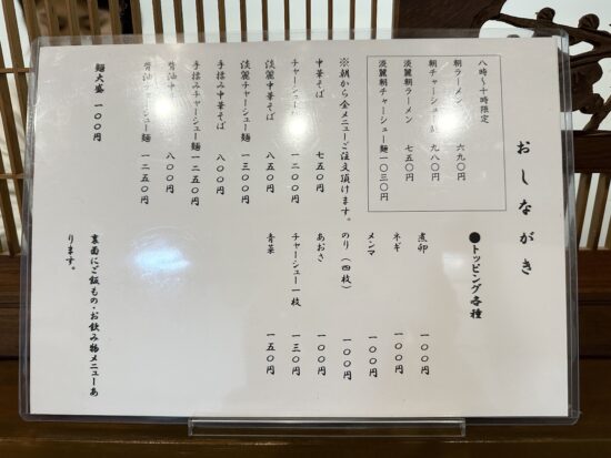 8時から10時限定の朝ラーのメニューは4種類。実はこの日一歩さんを訪れたのはお昼過ぎ。朝メニューは終わっていましたが、どれにしようか悩んでしまったので、店主へおすすめを伺い「中華そば(750円)」と「手揉みチャーシュー麺(1,250円)」を注文!