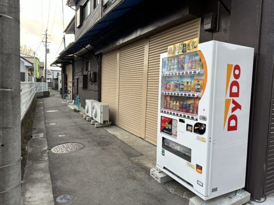 そこから稲荷神社北側の道路を東方向に約150m進むと右側に(DyDOの自動販売機)が見えてくるので、その細い路地を入っていきます。(MAP図②)