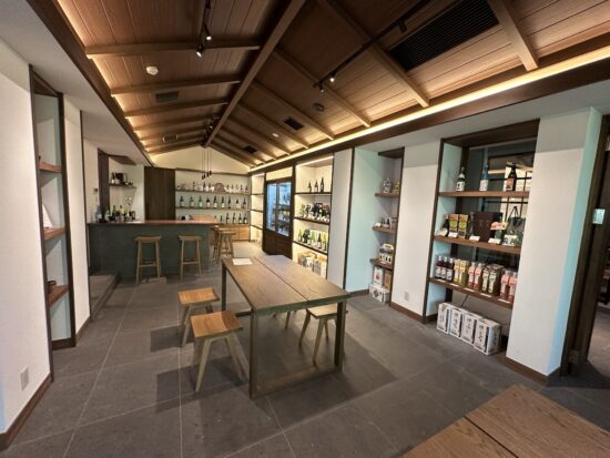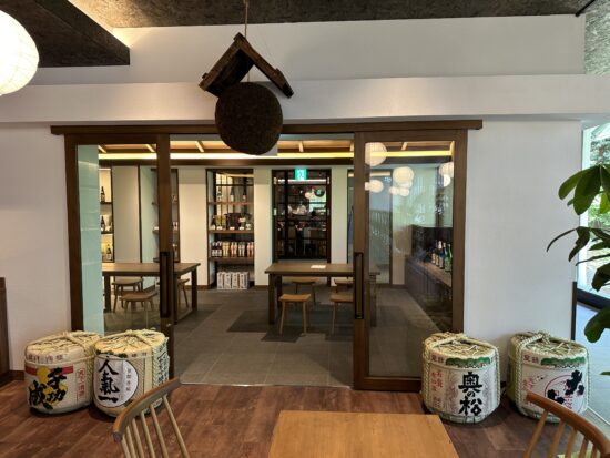 杉玉が飾られ蔵をイメージした「KURA」。地酒を中心に試飲・購入ができる酒蔵ショップで、とってもいい雰囲気。