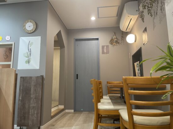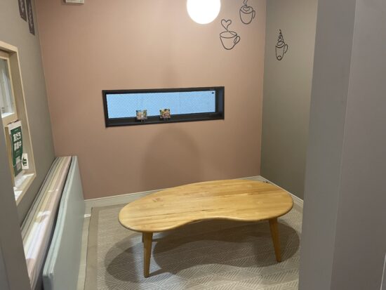 お子様連れはもちろん、誰にも邪魔されずにカフェタイムを楽しみたい方、ママ友会など、お客様のニーズに沿って利用可能とのことで、私が最もお客様想いと感じたところ✨くすみカラーでとても落ち着き、テーブルもころんとしているので小さなお子様がいても安心、女性は特に好みな空間だと思います♪