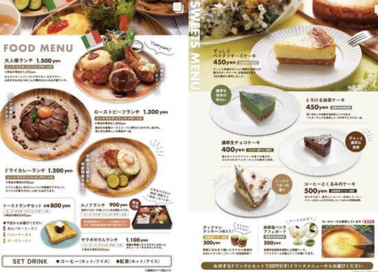 フードメニュー・スイーツメニューそれぞれ数種類あり、フードは女性も男性もちょうどいいボリューム!スープとデザート、ドリンクまで全てついているのでお得なセットランチになっています☆彡