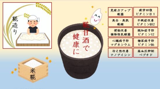 私たちがオススメする甘酒選びのいちばんのポイントは…「糀とお米」を発酵させて作られた『糀甘酒』にしました。甘酒には「酒粕から作るもの」と「糀から作るもの」の2種類あるのですがこれは原料の違いです。甘酒という言葉が入っていますが、糀甘酒ならアルコール不使用、且つ、今回選んだ甘酒は食品添加物や砂糖も使っていないので、子どもから年配の方まで安心して選んでいただけます。