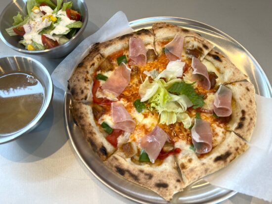 ピザには、サラダとスープも付いています。ピザ生地には福島県産米「天のつぶ」の米粉をブレンドしているため、外側はカリッと、中はモチモチとした食感です。