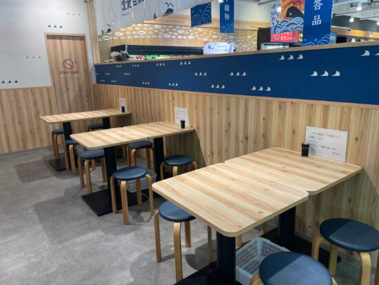 店内入口から入り、左手側を見るとすぐ潮目食堂がわかります。おのざき平総本店自体、開放的な空間となっていることもあり、迷うことなく潮目食堂を発見できると思いますよ~✨