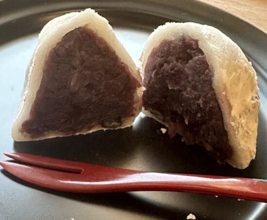 半分に切った断面を見ていただいたらわかるように、かなりあんこぎっしり!中のあんこは全て粒あん。さっそく一口食べてみると、想像通り餅がもっちりしていながら適度な柔らかさ(ふっくら加減)があり、口当たりが最高。そして中身のあんこは、赤エンドウ豆の程よい質感と塩味、何とも上品な甘さでかなりおいしい!1個じゃ足りないくらい、ぺろりと食べられます。