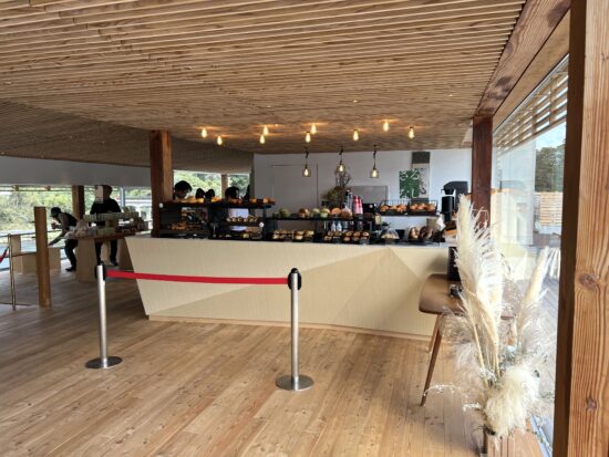 2Fはベーカリーになっており、奥にはカフェスペースが併設されています。阿武隈川との景色の一体感のために、カウンターも椅子も極限まで薄さにこだわって製作されました。
