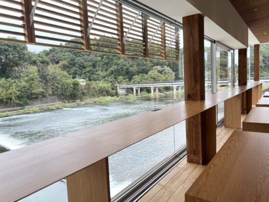 細長い板が平行に組まれる「ルーバー」というデザインが、天井や外壁など建物全体に施されており、木材はすべて福島県産の杉を使用しているそう。木をふんだんに使用したこの雰囲気、心が和み、ほっとします…そしてここ、実は1Fではなく2Fなんです!びっくり😲(1Fについては次回ご紹介😉)
