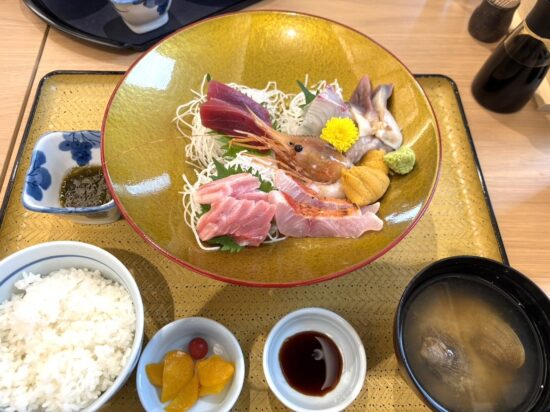 常磐ものを中心にその日とれた新鮮な魚を贅沢に使用している刺身定食🐟✨金目鯛は、皮目が炙られていて香ばしさと甘みを感じました。ウニはクリーミーで濃厚、甘みが強くて海の香りが広がります。刺身の脂の旨さやウニの濃厚さを味わった後の、ふっくらとした大ぶりのハマグリのお味噌汁はとても心が落ち着き、美味しかったです。