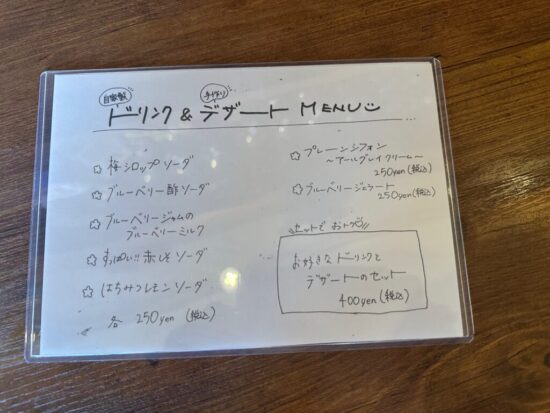こちらのブルーベリー酢ソーダも自家製。酸味が強く、暑さ疲れの体に染み渡る美味しさでした。