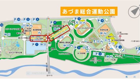 いちょう並木へは、P⑦公園西側の大駐車場をご利用いただくと便利です。車いすやベビーカーでも通行いただけます。