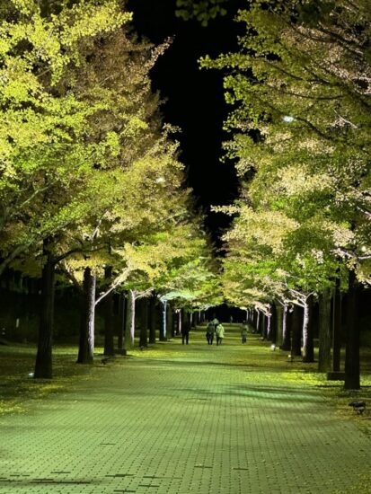 約520mの園路に植えられた116本のいちょうが色づくのに合わせて、17時~20時までライトアップも行われ、昼間とは違った雰囲気を楽しめますよ~☆.。.:*・°
