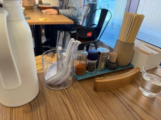 店内はとても清潔で整っており、おひとりさま用のカウンターの他、テーブル席もいくつかあり、おしゃれな感じです。スペースも十分にあり、ラーメン屋さんには見えないモダンな雰囲気✨