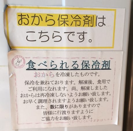 とっておきは、お豆腐屋さんらしい心づかいがあります。お持ち帰りする際の保冷剤は、なんと凍らせたおからをサービスしてくれます。もちろん、解凍して食べられるのでとってもお得で嬉しいですね😊